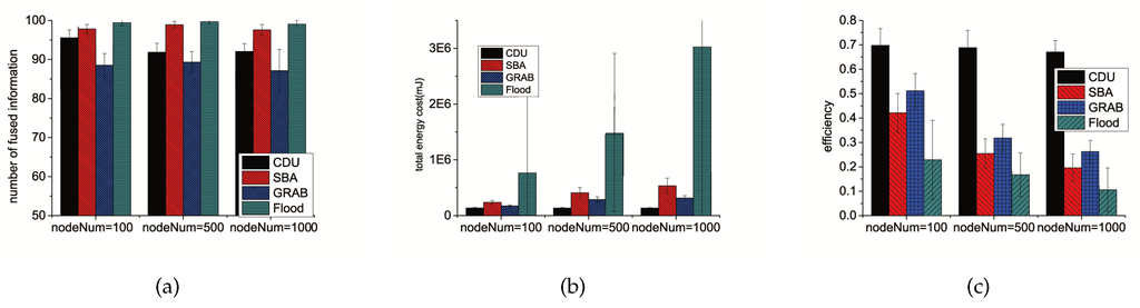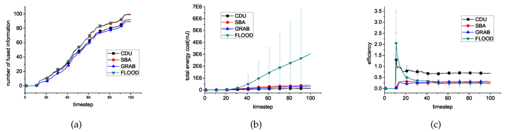 In general, Flooding and SBA can fuse almost all the information. Correspondingly, their energy cost is higher than CDU because of flooding’s no limitations on broadcast and SBA’s purpose to cover all sensors with all data until it is possible to fuse them. GRAB fuse less information than CDU while consuming more for the long path to relay data to the fixed sink node. The efficiency of CDU is the highest of these algorithms for its effective constraining broadcast of the useless data.