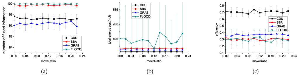 Experimental results with different move ratio using different algorithms. (a) introduces the comparisons of the number of fused information; (b) introduces the comparisons of the energy cost on communication; (c) introduces the comparisons of the fusion efficiency.