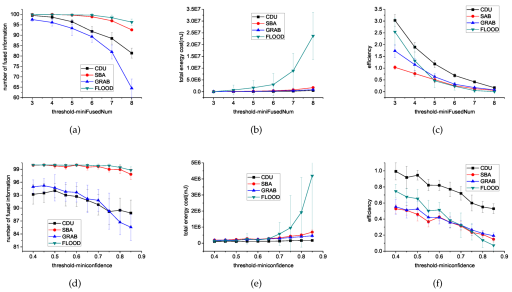 Figure 7 shows that when the threshold of minifusedNum or minifusedConfidence is higher, less information can be fused in the same 100 time steps. However, more energy consumption and lower efficiency on data relay for a sensor is needed to aggregate more data to reach the number and confidence threshold. Figure 7c,f show CDU has the highest efficiency of all these algorithms.