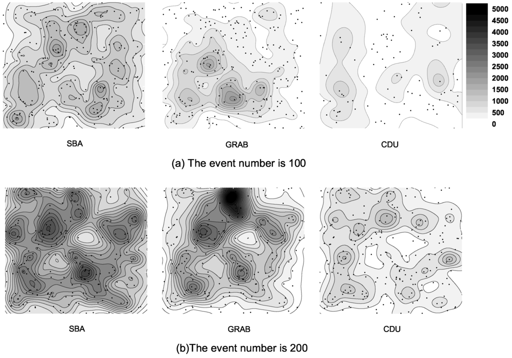 In this subsection, we compare the energy distribution between CDU and SBA, and the routing protocol GRAB. Figure 8 shows the final energy distribution after relaying data for 100 and 200 events while the network size is 500. As shown in these figures, the three algorithms all consume more energy in Figure 8b, where more events happened than in Figure 8a. In SBA and CDU, energy consumption is better distributed than in GRAB. For GRAB, data should be relayed to sink node to fuse and sink nodes, and nodes near sink nodes distinctly consume more energy. However, in SBA, sensors try to cover every node with data until fused, and the energy is much more than CDU.