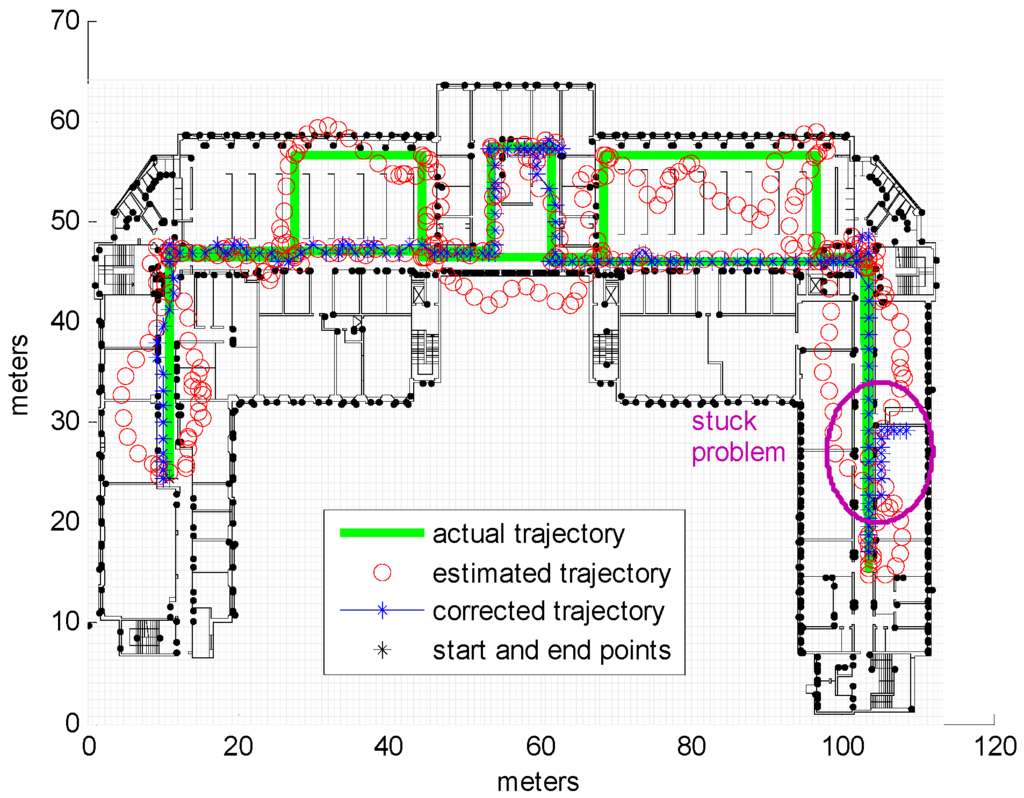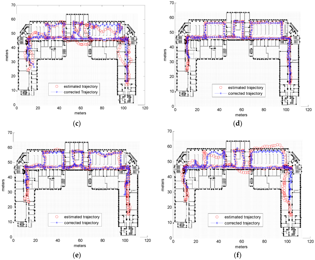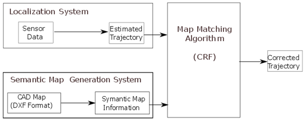 - The map matching algorithm that refines the estimated trajectory (path) using the CRF technique and the semantic floor plan information.