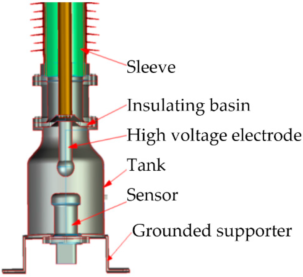 The installation structure diagram of an OVT is shown in Figure 2. The voltage sensor was installed inside the bottom tank of the insulator. The voltage to be measured was applied to the voltage sensor through a high voltage electrode in the insulating sleeve. The insulation between the high voltage electrode and ground was reinforced by the insulating basin and SF6 gas. The external tank was grounded to shield the external stray electric field. The output light signal of the voltage sensor was led out from the bottom of the cavity, and the signal demodulation was carried out at the bottom grounded supporter or in the control room.