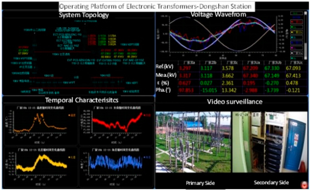 Three OVT prototypes based on the structure of Figure 2 were selected with the following parameters: rated voltage of 110/ kV, rated frequency 50 Hz, accuracy class 0.2, rated secondary output digital quantity 2D41H. The temperature tests (Figure 3) and adjacent phase effect tests (Figure 4) for the OVT prototypes were carried out in laboratory. Then the prototypes were transported to the Dongshan substation in Hegang City (Heilongjiang Province, China) which is an extremely cold area. The field off-line accuracy was tested (Figure 5) before being put into operation. The on-line test results in operation (Figure 6) were transferred to the monitoring system (as shown in Figure 7) located in Wuhan City. Details of the tests are shown in Table 1.
