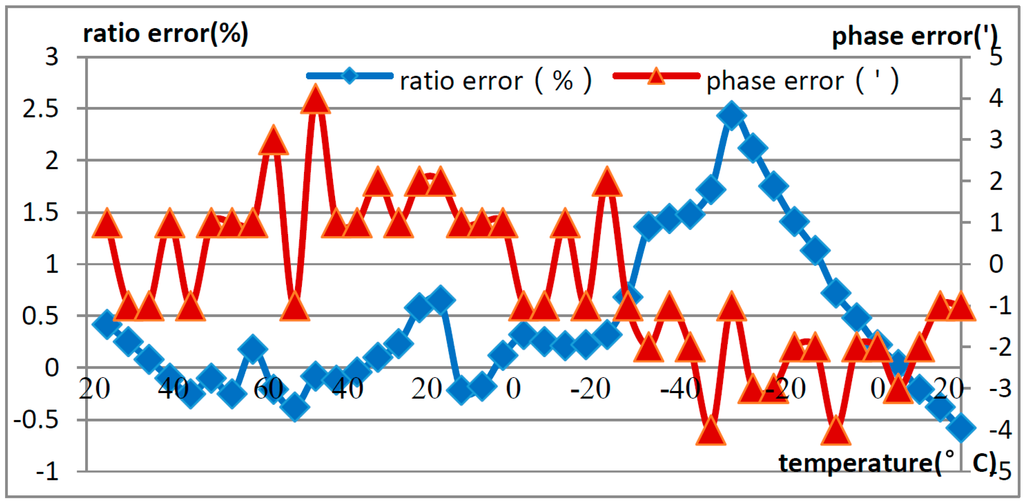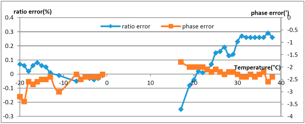 The OVT prototypes were put into operation in August 2014, then the data from September 2014 to October 2015 were selected as analysis object. The operation during the two summer and winter seasons which display the greatest temperature difference, were used to illustrate the operational characteristics of the OVTs. The data shown in Figure 13 correspond to August 2015 when the temperatures ranged from 17 °C to 38 °C and December 2014, when the temperature ranged from −20 °C to −1 °C, respectively. In Figure 10, the ratio error and the phase error were calculated using Equations (2) and (3).