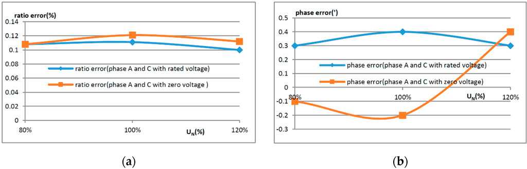 When the three phase voltage transformers are installed at a certain distance, adjacent phases may interfere with each other. In order to investigate the extent of their mutual influence, three phase OVTs were set at 1 m spacing intervals. The error of the middle phase B was tested when the voltage of phase A and C was applied at zero volts and the rated voltage, respectively. The testing results are shown in Figure 11, where the ratio error and the phase error were calculated by Equations (2) and (3).
