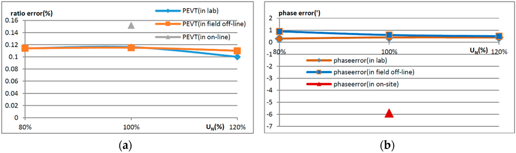 After testing the temperature characteristics and adjacent phase influence in the laboratory, the OVT prototypes were transported to the Hegang substation. The accuracy was tested before being put into operation. The error curves of OVT in the laboratory, in off-line state in the field and in the on-line state are shown in Figure 12. In order to exclude the effect of temperature, the tests in the laboratory and the field off-line tests were carried out at ambient temperature (20 °C). The online operation data was collected during 5 August to 8 August 2014, when the temperature was close to 20 °C. In Figure 12, the ratio error and the phase error were calculated by Equations (2) and (3).