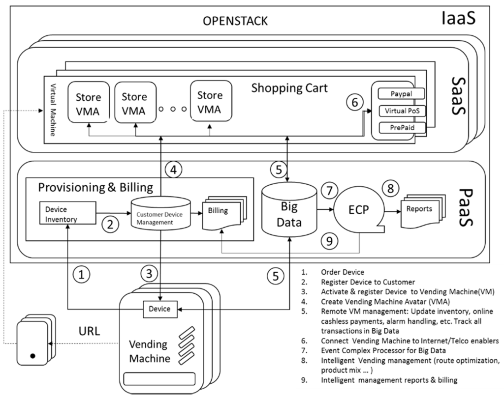The Figure 4 shows the proposed high level system design applied to vending machines. It also describes the provisioning, management and billing flows to have a fully functional end to end solution. This paper focuses mainly on step 4: the instantiation of the vending machine avatar in the Cloud.