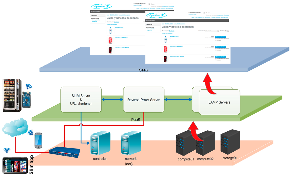 As a proof of concept in this paper a vending machine to make it smarter is retrofitted. The evolution of the traditional architecture of buying in a vending machine by a cloud-based architecture is proposed. The core processes of the buying are offered through a SaaS business model. In this way, vending machines are connected and integrated in a cloud environment. It reinforces the concept of IoT by making objects smarter thanks to ubiquitous connectivity and new cloud computing paradigms []. This approach is achieved by moving business logic from real vending machines to the cloud. Usually, vending machines are owned and managed by vending operators. Therefore, vending machines are grouped and configured in a cloud multi-tenancy architecture where tenants are associated to vending operators and each tenant serves several vending machines. The open software used in the SaaS layer is OpenCart [], a multistore shopping cart. This platform makes possible to offer service to many vending machines using a single domain. In this way there is no dependence on external Domain Name Server (DNS), apart from the public DNS where the domain is registered.