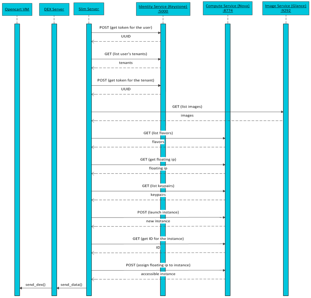 Sequence flow between SLIM and OpenStack’s components to instantiate OpenCart.