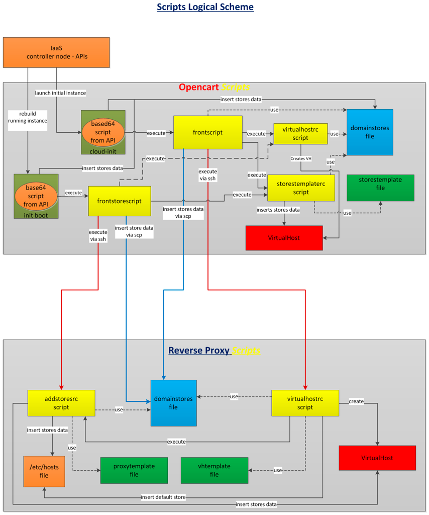 Figure 10 describes the scripts’ logical flow (see details in []). It can be noted that initially scripts are executed in the virtual machine where OpenCart is roll out, during instantiation time. From there, the execution flows to the reverse proxy. Once the cycle is finished, vending machines can be accessed from the Internet.