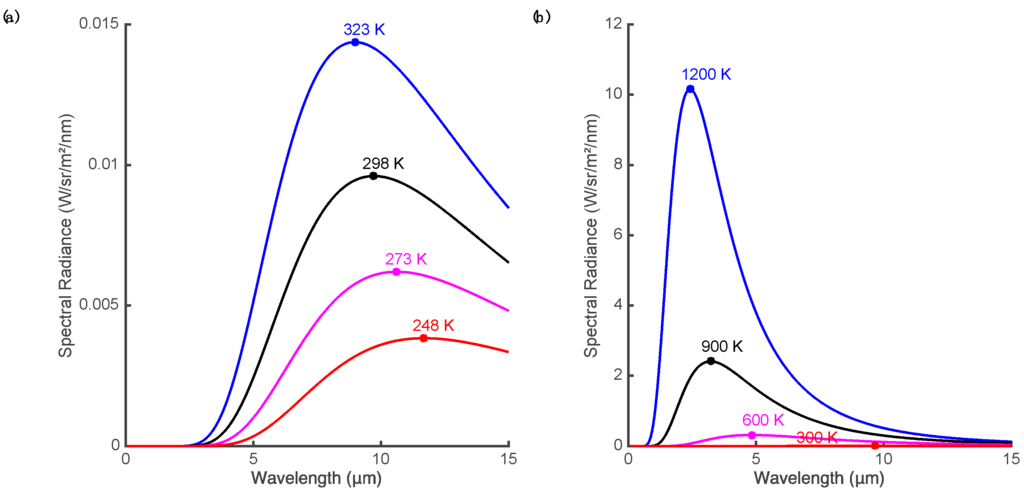 As fires burn much hotter than the typical temperature of surfaces on the Earth, heat provides a strong signal for the detection of fire. Heat is transported from the fire by convection, conduction and radiation but radiated heat is the main signal that can be remotely sensed. All matter radiates temperature-dependent electromagnetic radiation at temperatures above absolute zero. The emission of a blackbody radiator at thermal equilibrium follows Planck’s law, which describes the spectral radiance distribution as a function of wavelength of the emitted electromagnetic radiation (see [,] for a review of these concepts). The total energy (integrated across all wavelengths) radiated from a blackbody surface increases rapidly with its temperature (proportional to the fourth power of temperature, T4, as described by the Stefan-Boltzmann law []). However, the radiance is not uniform across wavelength and the distribution peaks at a wavelength that varies inversely with the temperature (Figure 1a). At normal ambient temperature, this peak is in the range 8–12 µm and most of the radiant energy lies at wavelengths greater than 5 µm. This distribution is why the 8–15 µm range is often termed the thermal imaging band or the thermal infrared (TIR) region. At higher temperatures typical of smoldering fires or open flame (Figure 1b), the peak of the response shifts to mid-wave infrared (MWIR, 3–5 µm) or shorter wavelengths []. Note that strong atmospheric absorption makes some regions of the infrared spectrum unsuited for remote imaging, for instance 5–8 µm.