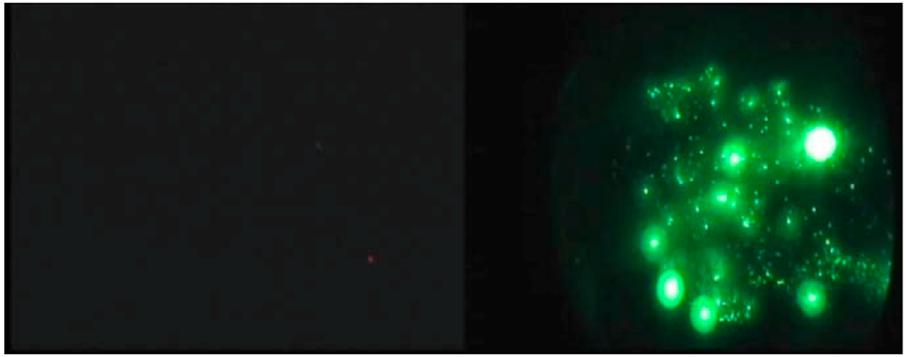 Night vision goggles based on image intensifiers have been used for fire detection but have limitations (see Section 4.2). Advanced night vision systems have been fielded and offer advantages including panoramic view, better response to bright sources and fused image displays. Fire detection relies on the detection of bright sources, which causes two issues in NVGs, saturation and halo. NVGs have an automatic gain control allowing the light amplification to vary with the ambient illumination increasing the operational range of the devices. Traditional systems had limited range for this control and were saturated with bright lights. They also could not be used (and possibly damaged) during daylight. The development of compact, gated power supplies for the latest generation image intensifier tubes [,] allows for larger range of ambient illumination including protection and operation at higher light levels that can be encountered with a large or intense fire.