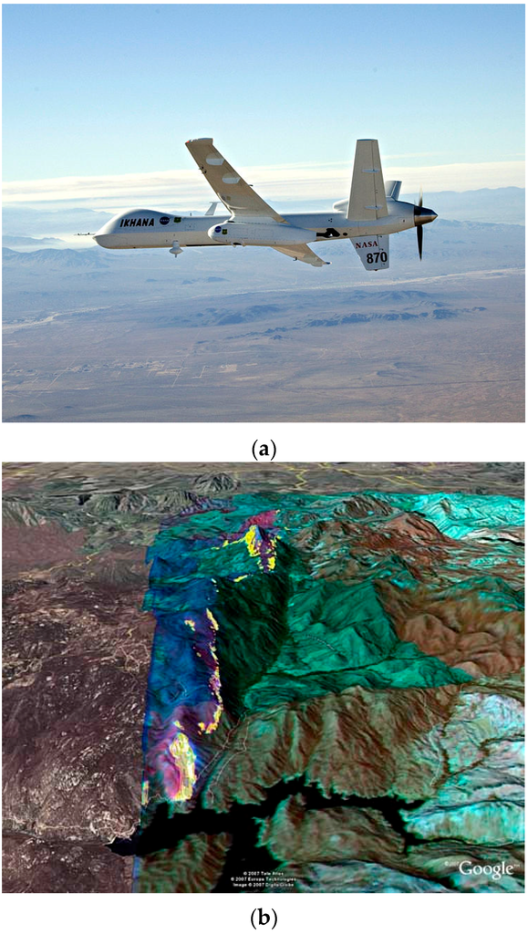 (a) NASA Ikhana UAV, a modified General Atomics Predator-B drone used for forest fire mapping; (b) Infrared imagery from the AMS sensor system aboard the UAV overlaid on a Google Earth map. Hot spots for a 2007 fire in San Diego County are indicated in yellow. Source: NASA.