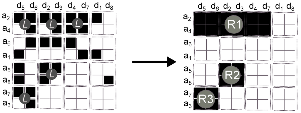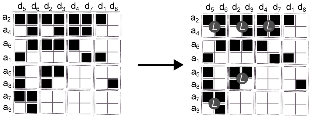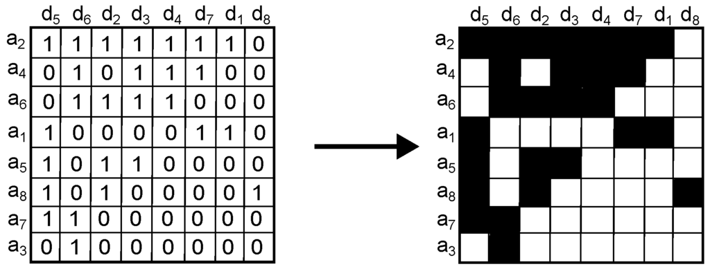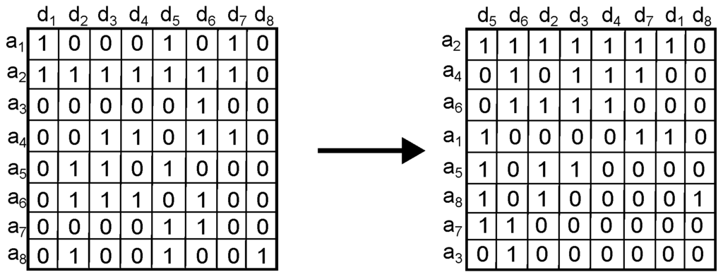 Figure 1. Step 1. Example of applying the sorting method on a matrix. IP addresses are denoted by the symbol while objects are denoted by the symbol .
