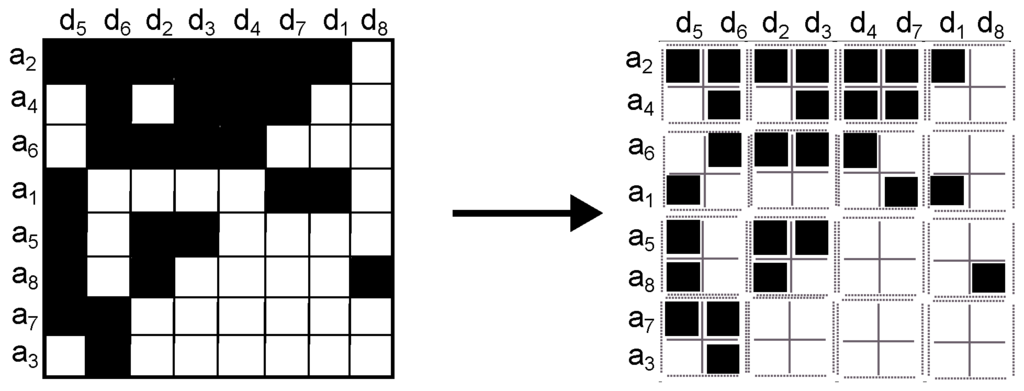 - Sort the matrix according to activity. Since we consider binary activity, a row with most of its agents querying for objects is considered more active than a row with few agents querying for objects; likewise, a column with most of its objects being queried for is considered more active and vice versa. This yields a matrix with most of the activity in the upper left corner (Figure 1).
