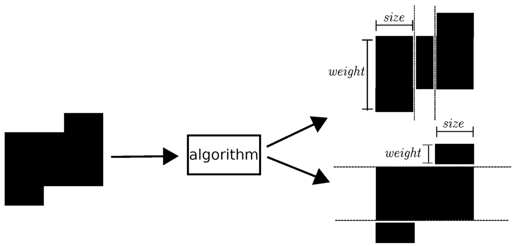 Figure 6 illustrates the process of applying our split algorithm to a region. First, it shows horizontal dashed lines where our algorithm has split the region. In the example, our algorithm found three groups where width and height correspond, respectively, to the size and weight of the group. Similarly, the algorithm shows vertical dashed lines in order to split the region. In this example, the algorithm found again three groups.