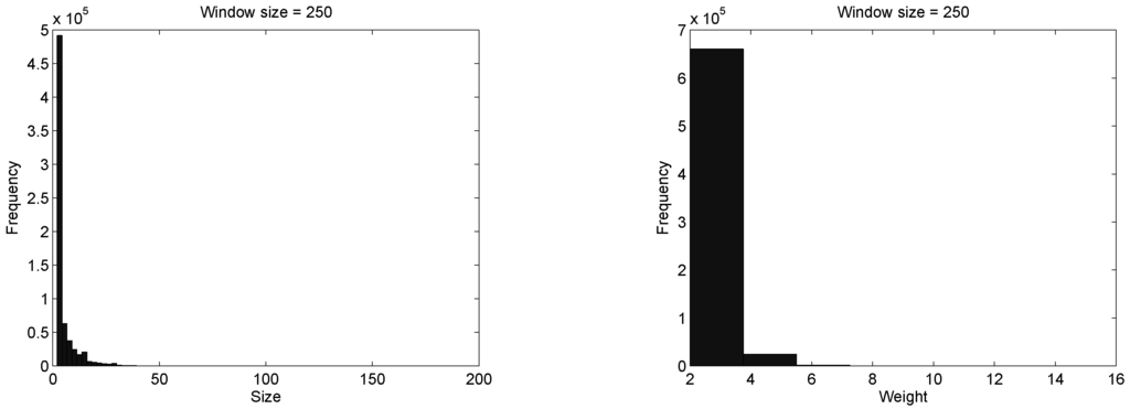 We have constructed a characteristic vector with the outcomes of the split algorithm. To this aim, we have analysed the distribution of the groups, estimated by the heuristic, in terms of size and weight from over 680 thousand windows. In this analysis we have considered windows of size: 125, 200, and 250. For the sake of simplicity, we only show the distribution of size and weight considering a window of size 250, in Figure 7.