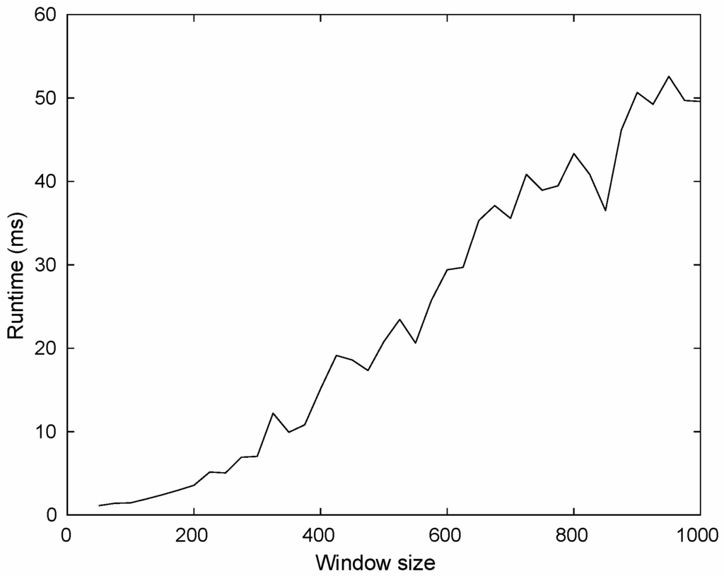 Now, we report the average time to construct the characteristic vector. To this aim, we have considered windows of size from 50 to 1000 in steps of 25, and randomly sampled 1000 windows for each window size. Then, we measure the average time to characterize a single window of a given size. Our experiment considers a Core i7 CPU 3.6 GHz using our current implementation in Python, the results are shown in Figure 8.