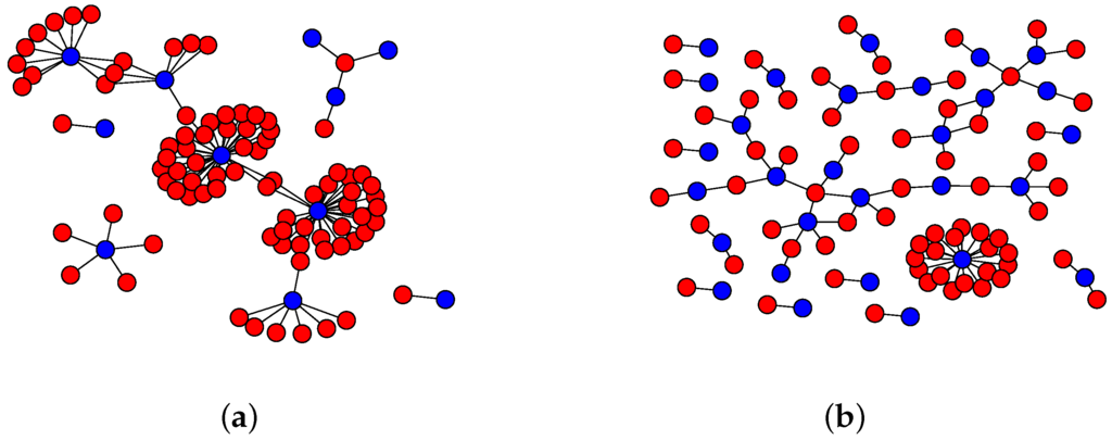 Take a query matrix and construct a bipartite graph in the following way. First, consider each agent as a vertex . Likewise, each object as a vertex . Last, take , i.e., a query from agent to object , and consider it as an edge . For now, we have ignored the frequency of queries m, so there is an edge between and if there is at least one query from to . Last, is such that it represents the activity of the recursive DNS server.