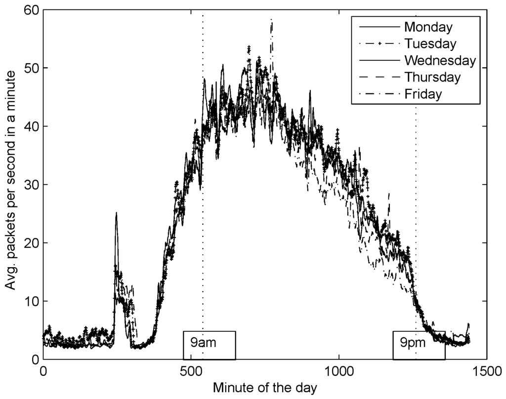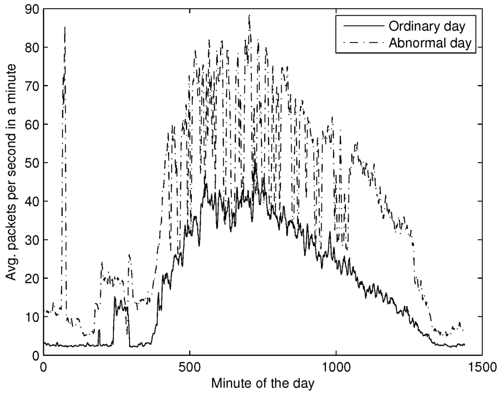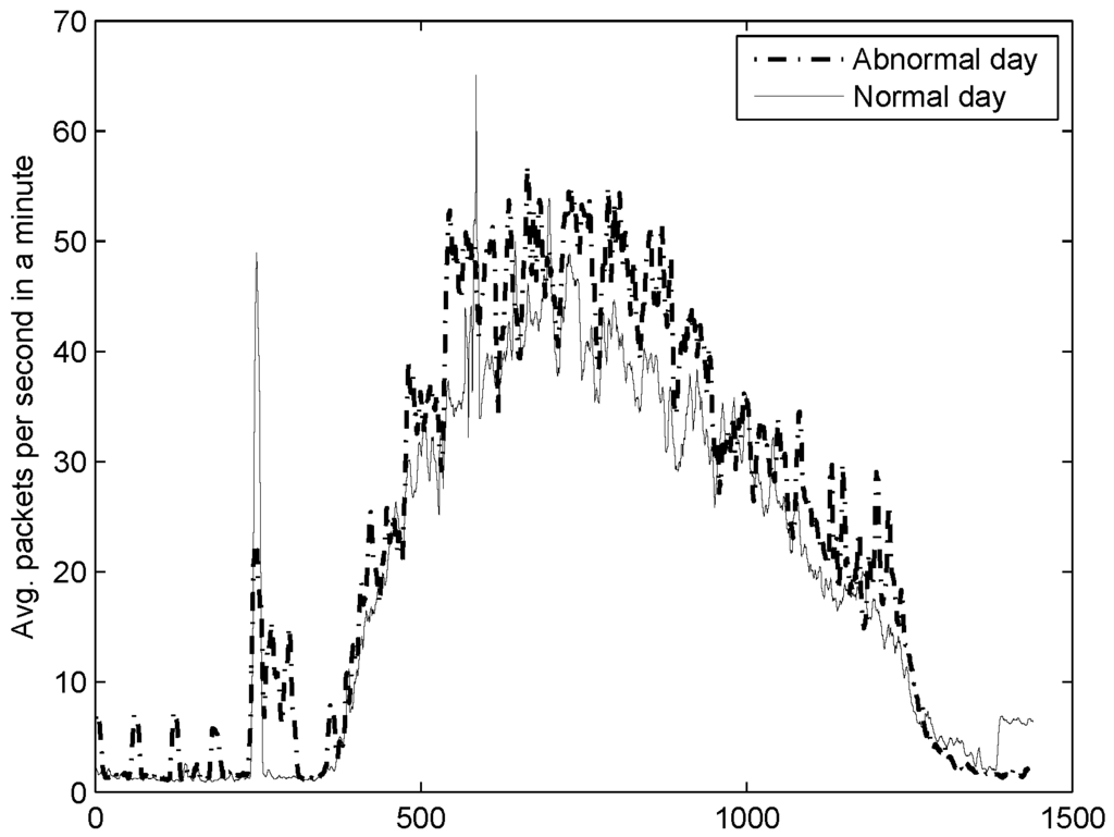 As a preliminary analysis we plotted the average packets per second in a minute, and contrasted it with an ordinary day (Figure 14). Notice that the average number of packets increased drastically with respect to ordinary traffic, showing an abnormal behaviour.