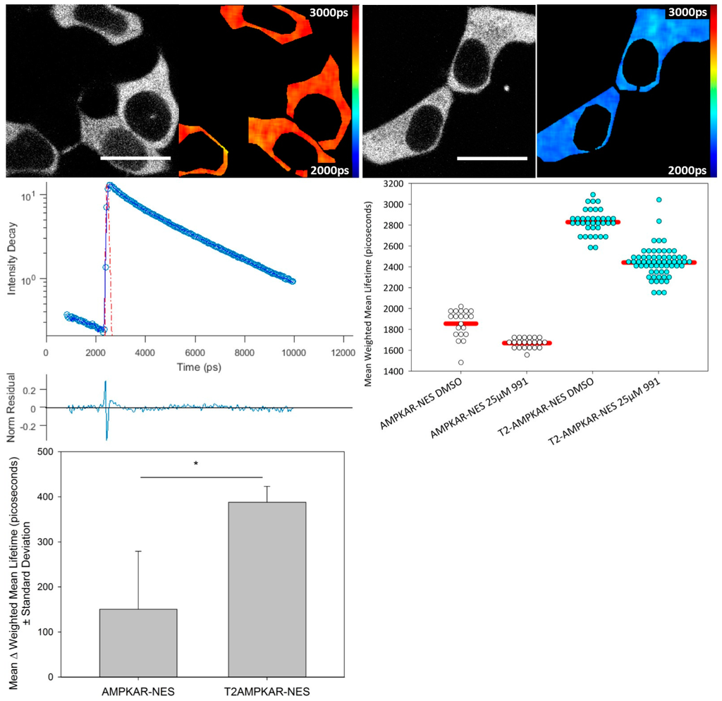 Confocal TCSPC FLIM of AMPKAR-NES and T2AMPKAR-NES. Top panel, exemplar intensity images and lifetime maps of T2AMPKAR-NES for both DMSO exposed (Left) and 25 µM 991 activated (Right) cells are shown; Middle left panel, exemplar fluorescence decay profile (blue circles) plotted with double exponential fit to data (blue line), IRF (red dashed line) and residuals (lower); Middle right panel, data shown are from three separate experiments. Fluorescence lifetimes for individual cells are shown in dot plot; Lower left panel, mean difference in biosensor mean weighted fluorescence lifetime (n = 3). Lifetimes are shown in picoseconds (shown in image). Scale bar = 20 µm.