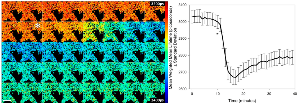 Time course of activation of AMPK by 991. (Left) time course montage of confocal TCSPC FLIM maps of T2AMPKAR-NES weighted mean fluorescence lifetimes, an image was acquired each minute; (Right) average weighted mean T2-AMPKAR-NES donor fluorescence lifetime in response to addition of 50 µM 991. The asterisk indicates the point of compound addition. Lifetimes are shown in picoseconds (shown in image). Scale bar = 100 µm.