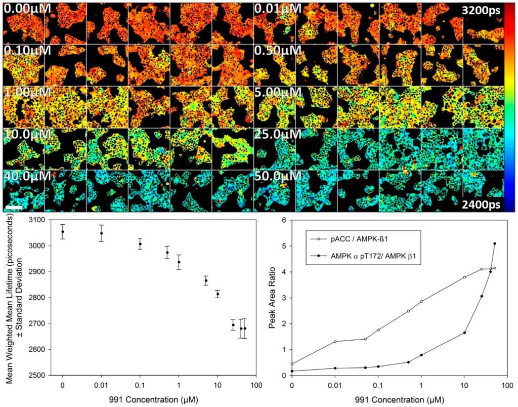A study of the dose response for activator 991 was then undertaken using FLIM of the T2-AMPKAR-NES biosensor stably expressed in HEK293T cells in 2D cell culture. The variation in donor lifetime as a function of 991 concentration measured 2 h after treatment by confocal TCSPC FLIM is presented in Figure 4. A response to the compound is evident at 100 nM 991 and reaches a maximum response at 25.0 µM as assessed by imaging. For comparison, a dose response curve obtained using a biochemical assay (automated Western blotting) is also presented and shows a similar response (albeit inverted in the vertical direction) due to the fluorescence lifetime decreasing and the peak area ratio increasing with concentration of 991. AMPK-α phosphothreonine 172 is used as a biochemical marker for AMPK activation and is normalised to AMPK β to provide a measure of AMPK activation. Phospho-acetyl CoA carboxylase (pACC) is a marker of AMPK output and is used for comparison here as the biosensor is phosphorylated in a similar fashion as an output of AMPK activity.
