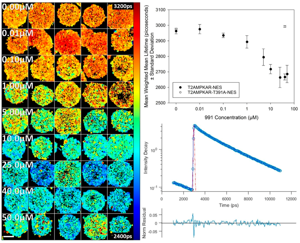 Titration of 991 in spheroids expressing T2AMPKAR-NES using TPE TCSPC FLIM. Left panel: FLIM map of weighted mean fluorescence lifetime with increasing concentrations of 991 (shown in panel). Upper right panel: plot of the mean weighted mean fluorescence lifetime dose response for 991. Comparison of spheroids expressing T2AMPKAR-T391A-NES is also shown; Lower right panel: exemplar fluorescence decay profile (blue circles) plotted with double exponential fitting (blue line), IRF (red dashed line) and residuals (lower). Lifetimes are shown in picoseconds (shown in image). Scale bar = 100 µm.