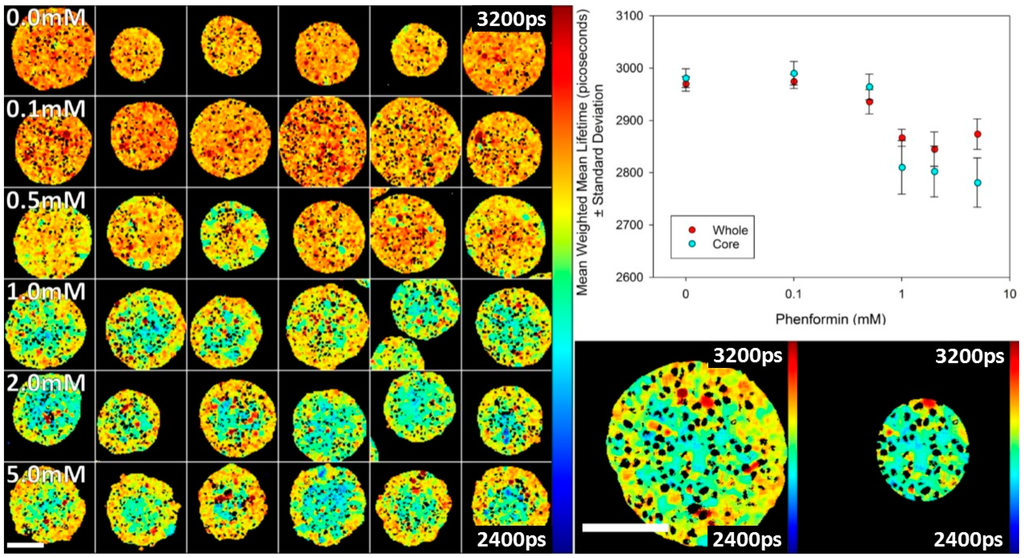 Titration of phenformin in spheroids expressing T2AMPKAR-NES using TPE TCSPC FLIM. Left Panel: montage of FLIM maps of the weighted mean fluorescence lifetimes as phenformin concentration is increased (shown in panel). Upper right panel: plot of the whole spheroid and core mean weighted mean lifetimes; Lower right panel: exemplar images of the whole spheroid and core region segment. Lifetimes are shown in picoseconds (shown in image). Scale bars = 100 µm.