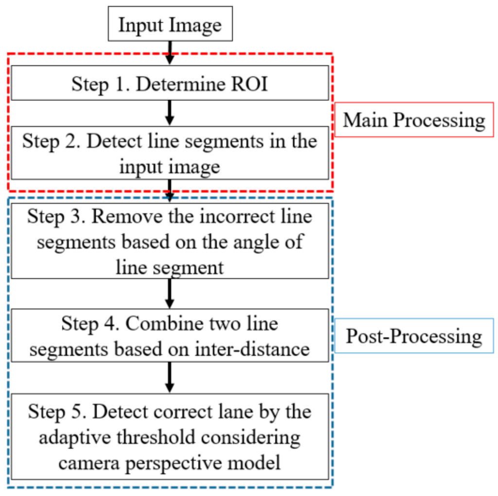 Figure 1 depicts the whole procedure of our proposed method. In our lane detection system, the algorithm has two main stages, main processing (Step 1 and Step 2) and post-processing (Step 3 to Step 5). In the first step, we define the ROI of the captured image and locate the line segments in the ROI. Then, we remove incorrect line segments based on the angles of the line segments and by merging them according to their inter-distance. Finally, using the perspective camera model, we determine the adaptive threshold to measure the distance and use it to detect the final line segments of the left and right boundaries of the road lane.