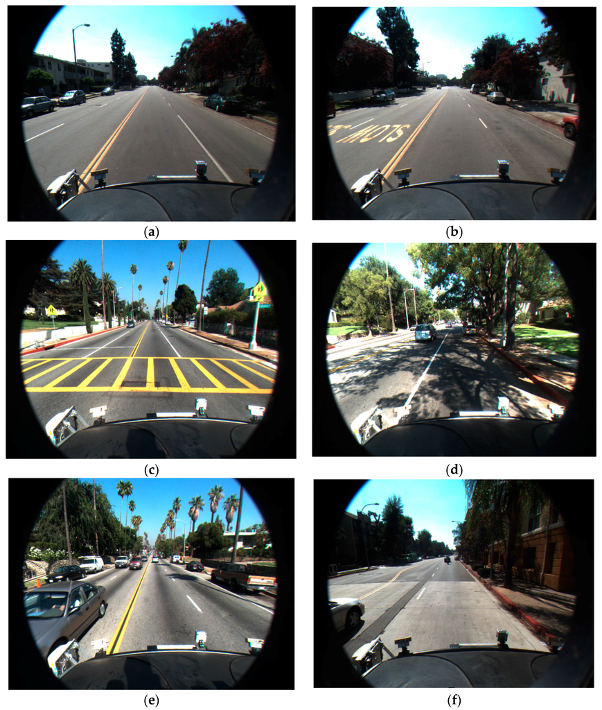 Examples of input images: (a) input image without road markings, crosswalk and shadow; (b) input image including road markings; (c) input image including crosswalk; and (d–f) input images including shadow.