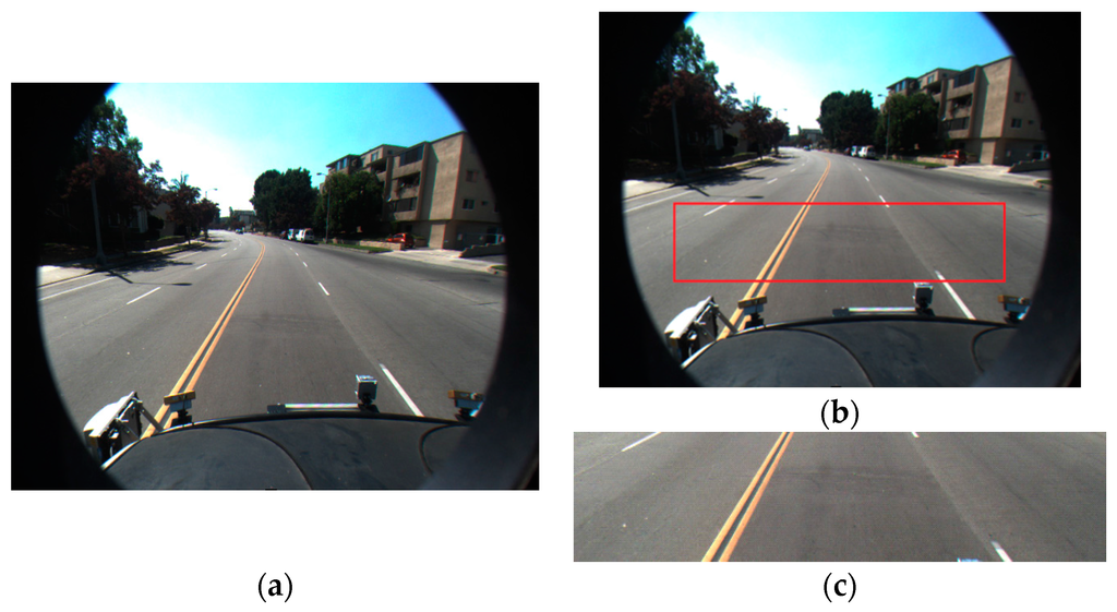 Defining the ROI in the captured image gives us two advantages. First, lanes always appear within the predetermined region of the image when the position and direction of the camera are fixed. This is shown in Figure 2, Figure 3 and Figure 4. Therefore, we do not need to perform lane detection in the whole image, but only in the restricted area. If the lane detection is done only in the ROI and not in the whole image, the effect of environmental noises such as rain, fog, or poor weather conditions can be lessened. In addition, the complexity and computational time of the lane detection can be significantly reduced.