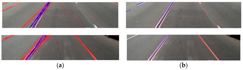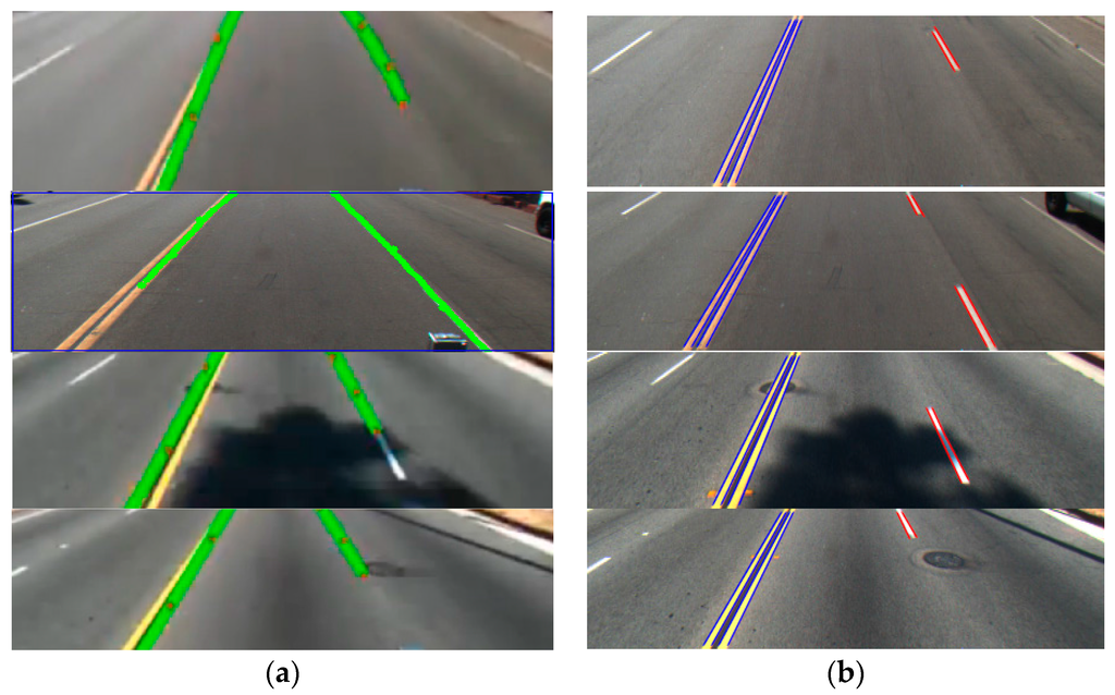 In Table 3, we compare the lane detection accuracies of Aly’s method [12] and ours, and confirm that our method outperforms Aly’s method [12]. The reason why Aly’s method is less accurate is that Aly’s method cannot accurately discriminate between the dashed and solid lanes as shown in Figure 14. In addition, his method does not detect the left and right boundaries (the red and blue lines of Figure 14b) of each lane. As explained earlier, in our experiment, all the ground-truth positions are marked at all the starting and ending points of the left and right boundaries of dashed and solid lanes. Based on the inter-distance between the two starting positions (ground-truth position and that detected by algorithm) and that between the two ending positions (ground-truth position and that detected by algorithm), whether the detection is successful or has failed is determined. Therefore, Aly’s method gave much higher error rates than our method.