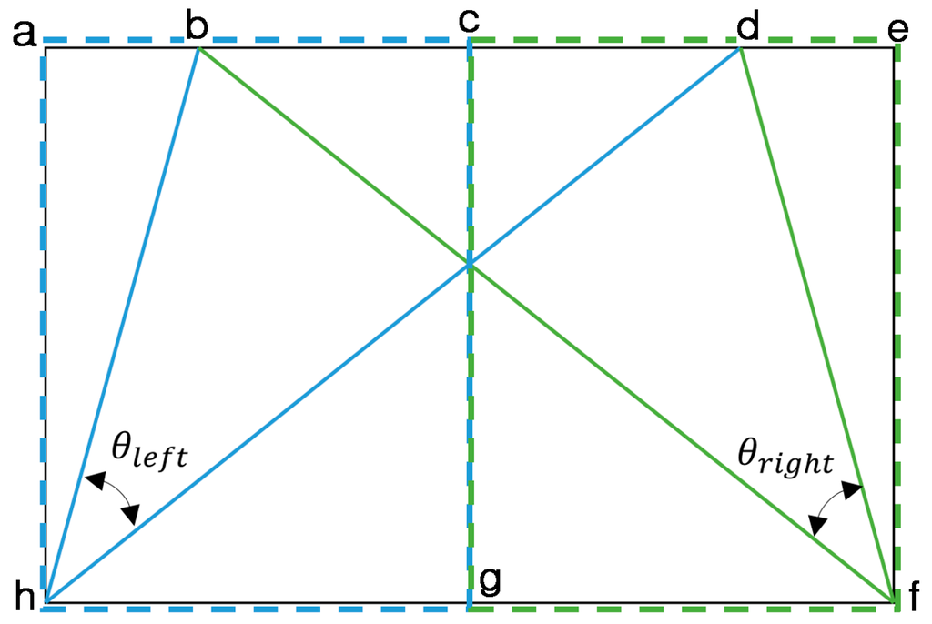 As Figure 5b illustrates, the LSD algorithm also detects many incorrect line segments. We need to eliminate the incorrect line segments to reduce the computational time and complexity. In our research, we first use the angle of a road lane to eliminate the incorrect line segments. In Figure 6, the left side (the rectangular region of acgh) and right side (the rectangular region of cefg) are divided, and two angular ranges ( and )) for the correct line segments are determined on each side, as shown in Equations (3) and (4). The same parameters of angular ranges of Equations (3) and (4) are used in two open databases of our experiments in Section 4. Because vehicle including camera usually moves between left and right road lanes, the left and right road lanes can be estimated to be included in the areas of triangles (bdh) and (bdf) of Figure 6, respectively. Here, defines the angular area between two lines of bh and dh of Figure 6. defines the angular area between two lines of bf and df of Figure 6.