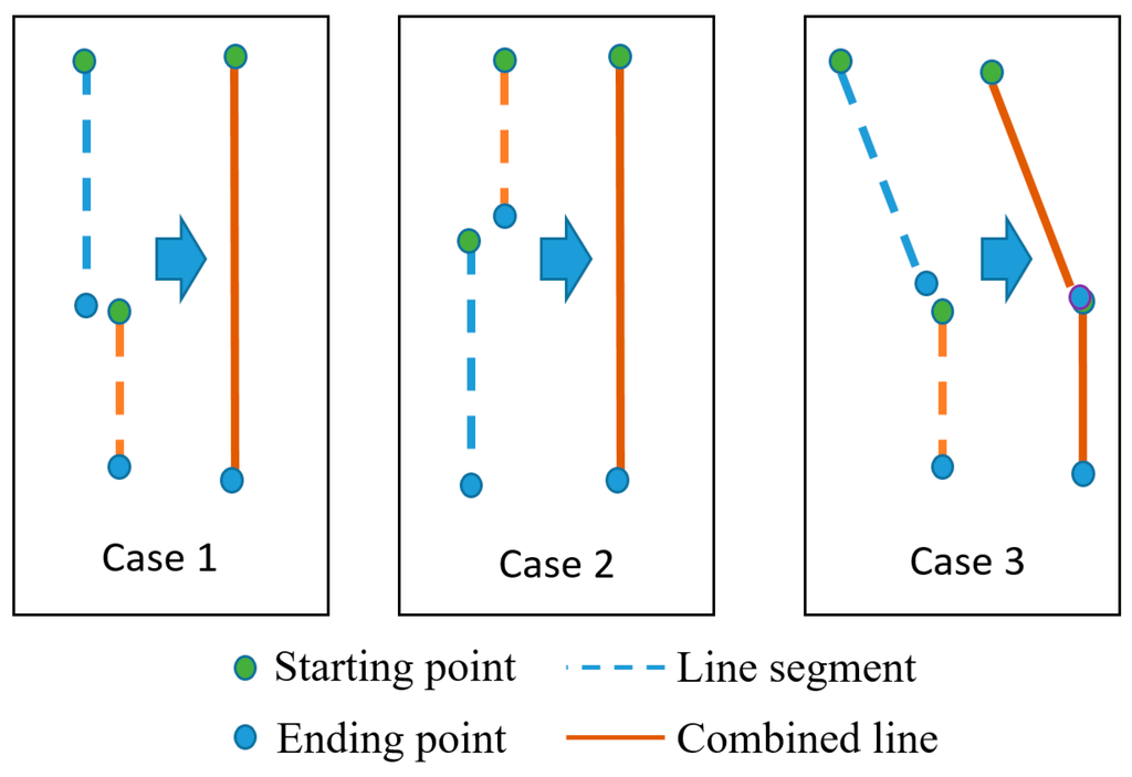 Figure 8 shows three cases where two or more line segments are combined into one longer one. The first two cases make one straight line whereas the last one makes a curve line. As mentioned in the previous section, we assume that the starting point of a line segment has a lower y-coordinate than the ending point. The dashed lines in Figure 8 denote line segments, whereas the solid lines represent the merged line segment. Blue and green circles represent the starting point and ending point, respectively.