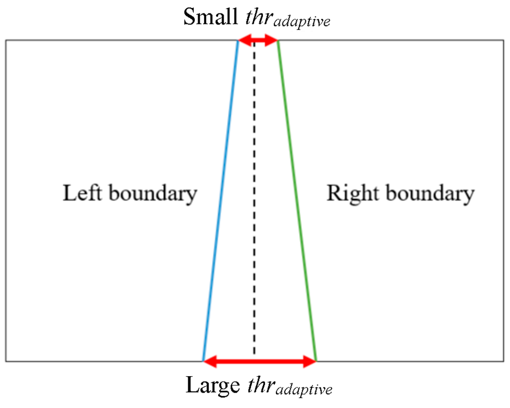 A road lane always includes a left and a right edge boundary. If a detected line is on the left boundary, it has almost certainly a symmetrical counterpart on the right boundary and vice versa (Figure 9). From a camera view, the road lane appears as a trapezoid in the image as shown in Figure 9. This is because in a perspective camera model the further two points are away from the camera, the smaller their distance appears. Therefore, the adaptive threshold is determined by measuring the inter-distance between two starting points or ending points, as shown in Figure 9. Based on this threshold, we combine the two lines together. If the distance between the two starting positions and the distance between the two ending positions are less than the adaptive threshold (thradaptive of Figure 9), the two lines are regarded as the correct left and right boundaries of the lane. In our research, thradaptive has the range from 6 to 14 pixels. In the case of small thradaptive in Figure 9, 6 pixels are used, whereas 14 pixels are used in the case of large thradaptive in Figure 9. In the case of intermediate position between the upper and lower boundaries of Figure 9, the intermediate value by linear interpolation from 6 to 14 pixels is used as thradaptive according to the Y position of line. Same parameter of thradaptive is used in two open databases of our experiments in Section 4. However, thradaptive is proportionally changed based on the width and height of the original image.