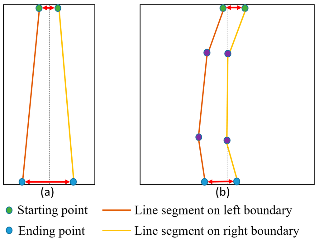 However, in the case of a curve lane, we detect several line segments from the left and right boundaries as illustrated in Figure 10b. Consequently, we obtain several starting and ending positions for each line segment of the left and right boundaries. We select the two starting positions that have a y coordinate smaller than the other starting positions and the two ending positions that have a y coordinate larger than the other ending positions. We then calculate the distance between the two selected starting positions and the distance between the two selected ending positions. If the two distances are less than the adaptive threshold from the perspective camera model, we assume that we identified the correct left and right boundaries of the lane.