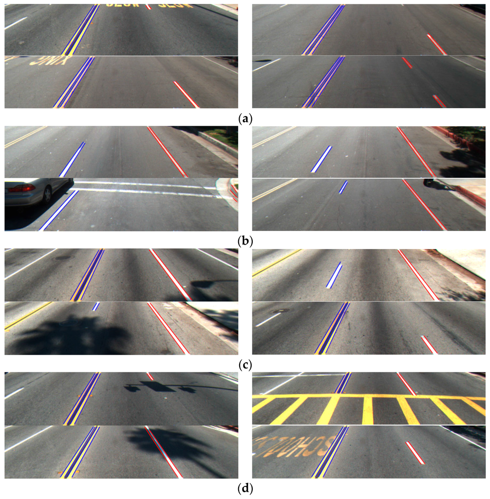 As shown in Table 5, our method outperforms Aly’s method [12] and Truong and coworker’s method [35] on SLD datasets, also, because their methods do not detect the left and right boundaries of each lane with the correct discrimination of dashed and solid lanes, either, as shown in Figure 16. The examples of detected results on SLD datasets are shown in Figure 16, which shows that our method can detect the starting and ending positions of lane with the discrimination of dashed and solid lanes more accurately than Aly’s method [12] and Truong and coworker’s method [35].