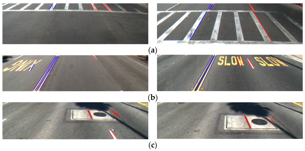 Examples of false detection: (a) crosswalk; (b) symbol markings of indicating word; and (c) non-road objects.