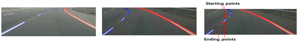 The reason why the accurate detection of starting and ending points is important in our research is as follows. In the case that the lane is changed from dashed lane to solid one, the car should not change its current driving lane. If there exists the error to detect accurate starting and ending points of dashed lane by autonomous car (self-driving car) at fast moving speed, it can causes the traffic accident. For example, assuming that actually dashed lane is ended, but the autonomous car misrecognize the situation as the dashed lane being still maintained due to the error to detect accurate starting and ending points of dashed lane. In this case, the car can change its driving path by crossing of dashed lane (but, actually solid lane). If there exists another vehicle (approaching at very fast speed) behind the autonomous car, and the driver in this vehicle thinks that there would be no lane crossing by the front car (autonomous car) because the dashed lane is ended, the dangerous situation of rear-end collision can happen. These are why we are interest in detecting the accurate starting and ending points of road lane (as shown in Figure 17) in our research.