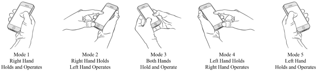 To address this challenge, we propose, to the best of our knowledge, the first scheme for detecting the current operating hand from touchscreen traces only, which is covered in [4] and the first scheme for detecting the hand-changing process. As for the scheme for detecting the current operating hand, we divide smartphone operation modes into five main categories based on numerous observations of users’ daily lives, as shown in Figure 2. User interfaces of large-screen smartphones can be adjusted for each particular mode, especially for Mode 1 and Mode 5, whose touching ranges are limited. The accuracy of detecting the current operating hand by our proposed scheme is 94.1% when deciding with a single trace only. As for the scheme for detecting the hand-changing process, after recognizing that the user is passing the smartphone from the right hand to the left hand, or vice versa, the user interfaces of large-screen smartphones can be adjusted accordingly, to make smartphones easy to operate by the left hand or the right hand. The accuracy of detecting the hand-changing process by our proposed scheme is 93.7% when deciding with a single segment only. These two schemes proposed in this paper can both work completely independently and achieve pretty high accuracies or they can also work jointly to further improve the recognition accuracy and reduce the false user interface adjustments ulteriorly, which depends on the user’s choice, after synthetically considering the accuracy, energy consumption and system overheads. This part is easy and can be flexibly arranged, so it is beyond the scope of this paper.