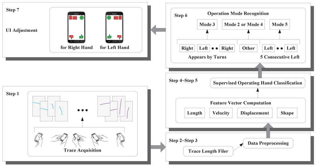 Here, we provide a system overview of our current operating hand recognition scheme as shown in Figure 3. The first step is the acquisition of touchscreen trace data from the smartphone touchscreen, which are organized in the form of a series of coordinate data with the corresponding timestamp at every sampling point. There is a length filter in the second step. Traces are delivered to this filter where the length of every trace will be compared to a certain threshold. Then, our scheme discards traces whose lengths are below this threshold, because these traces are too short to carry enough useful information, and features extracted from these traces provide a poor degree of distinction. Our scheme preprocesses the coordinate data of touchscreen traces in the third step in order to improve the accuracy of feature vector computation. In the fourth step, our scheme computes a feature vector consisting of features that can be utilized to recognize the current operating hand. Then, our scheme constructs a supervised classifier called Random Forest (RF), which outputs the recognition result for the current operating hand (finger), using features extracted in the fourth step. In the sixth step, our scheme recognizes the current operation mode (as shown in Figure 2) according to the continuous sequence of supervised operation hand classification results within a previous period of time. Our scheme recognizes user’s current operation mode as Mode 5 or Mode 1 when the results’ sequence contains at least n consecutive or n consecutive , respectively. n is a predefined variate that represents the tradeoff between the response time of our scheme and the recognition accuracy, and its value is five in this paper. Otherwise, if and appear in turn in the results’ sequence, then user’s current operation mode will be judged as Mode 3 by our scheme. Our scheme believes that the user is operating the smartphone with Mode 2 or Mode 4 when the operation hand classification result is . In the last step, there are many things the smartphone can do according to the operation mode recognition result, and the most relevant one is adjusting the user interface for the user if the recognition result is Mode 1 or Mode 5.
