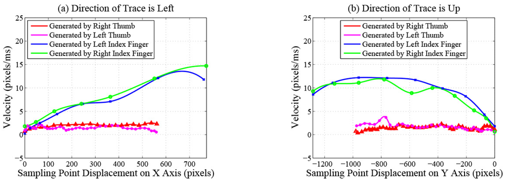 - Velocity features. Maximum and average velocity. Standard deviation of velocity. The changing process of the velocity on a trace contains two phases: acceleration and deceleration. The durations of acceleration processes are different between traces generated by index fingers and thumbs because of the different lengths of the traces. The deceleration processes of traces generated by index fingers are shorter because these traces often slide out of the touchscreens directly without deceleration. Therefore, the velocity features of traces generated by index fingers and thumbs are different. Figure 4 plots the change of the velocity magnitude with displacement on traces performed by different fingers of the same participant. The directions of traces are left in Figure 4a and up in Figure 4b. We can observe that, for this participant, velocity features can be utilized to distinguish traces generated by different fingers.