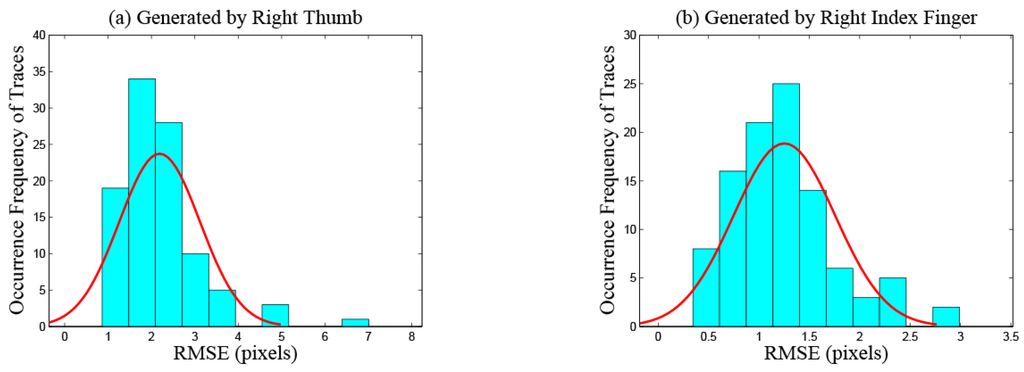 - Shape features. In order to describe the shape features of traces quantitatively and accurately, we carry out curve fitting on discrete sampling points of every trace using a quartic polynomial, which is a tradeoff among fitting precision, computational complexity and the degree of distinction on traces generated by different fingers.Root mean squared error. This feature measures the smooth degree of traces. Index fingers are more flexible and have larger touching ranges than thumbs. When operating smartphones, index fingers exert less pressure on touchscreens and receive less friction resistance, so traces generated by index fingers are always smoother than those generated by thumbs. The root mean squared error of trace is calculated as:where indicates the true y coordinate value of the j-th discrete sampling point on the trace and indicates the predicted y coordinate value of the j-th discrete sampling point calculated by carrying out curve fitting on the trace . indicates the number of sampling points on the trace . Figure 5 plots the distribution of the root mean squared errors from 200 traces generated by the right thumb (as shown in Figure 5a) and the right index finger (as shown in Figure 5b), respectively, of the same participant. The number of each kind of traces is 100, and all directions of the traces are right. We can observe that, for this participant, the values of the root mean squared error feature are different among traces generated by different fingers.