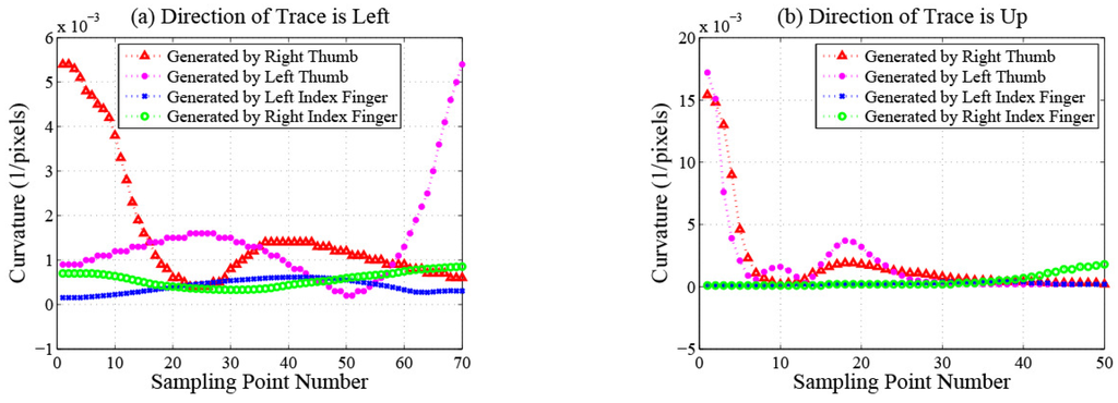 Figure 6. Curvature magnitude of each sampling point.Curve convex orientation. This feature measures the curve’s convex orientation, which can be very useful in distinguishing traces generated by the left thumb and the right thumb. To calculate the curve convex orientation of trace , first, we randomly choose a sampling point that is close to the middle of the trace. Second, we construct two vectors, which are from this sampling point to the first and the last sampling point, respectively. Then, we calculate the cross product between these two vectors.where and indicate the coordinates of the first and the last sampling point of trace , respectively. indicates the coordinates of the randomly chosen sampling point. Finally, the curve convex orientation of trace is calculated as:where is the sign function.