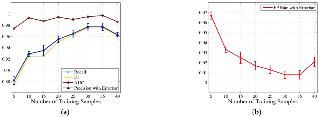 In this part, we indicate the impact of the number of training samples on the classification performance. The number of training samples is a significant parameter in the construction process of a classification model. On the one hand, if the number of training samples is too large, the workloads of training traces’ acquisition will become onerous for users. Moreover, although the training error of the classification model is low, the generalization error may be high sometimes, because the classification model is over fitting, which will lead to poor classification performance eventually. On the other hand, if the number of training samples is too small, the classification model will be under fitting, which also leads to inaccurate classification results. The number of traces in each test subset is five, so the total number of traces in the test set is 80 in this part. Figure 8 shows the change of classification performance with the increase in the number of traces in each training subset.