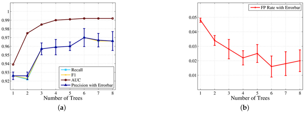 We can make two observations here. Firstly, the classification performance is significantly improved with the increase of the number of trees in RF from two to thee. As shown in Figure 9, the precision increases from 92.6% to 95.7%, and the FPR drops from 3.4% to 2.8%. This is because an RF containing three trees reflects the advantages of ensemble classifiers compared to a single DT for the first time. Secondly, the RF achieves optimal classification performance when there are six trees. Figure 9 shows that the precision can be as high as 97.0%, and the FPR achieves 1.6% accordingly.