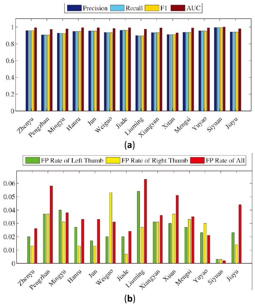 In this part, we evaluate our scheme on two sets of 14 participants (seven male and seven female participants). We ask every participant to generate traces in four directions with the right thumb, left thumb, right index finger and left index finger, respectively, among which left (or right) traces are generated by some operations, such as navigating among main screen pages or viewing images, and up (or down) traces are generated by reading documents or browsing web pages. The number of traces in each subset is 25. Then, we conduct a five-fold cross-validation experiment on these traces. The average precision, TPR, FPR of the left thumb and FPR of the right thumb over all 14 participants turned out to be 94.1%, 94.1%, 2.7% and 2.4%, respectively, when deciding with a single trace only. Figure 10a,b shows the bar plots of the evaluation results of 14 participants.