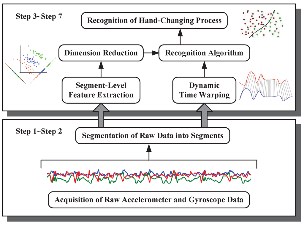 In our hand-changing recognition process, as shown in Figure 11, some dedicated processing steps are performed [17,18,19]. The first step is the acquisition of raw accelerometer and gyroscope data from smartphones, which are organized in the form of triples (x-axis, y-axis and z-axis) with corresponding timestamps. Then, an end-points detection-based segmentation algorithm is exploited to extract the segments we are interested in from these accelerometer and gyroscope data time series. In the third step, we compute a feature vector consisting of the time domain, the frequency domain and statistics features, which contain important cues for distinguishing segments generated by various actions. In order to evaluate the sparseness, to maximize the synergies between different features, we conduct the dimension reduction in the fourth step. In this paper, we also exploit the performance of utilizing Dynamic Time Warping (DTW) distances as features to recognize the hand-changing process, as presented in the fifth step. Finally, we construct a recognizer, which outputs the recognition results, namely hand-changing processes or other actions using features extracted in the former step.