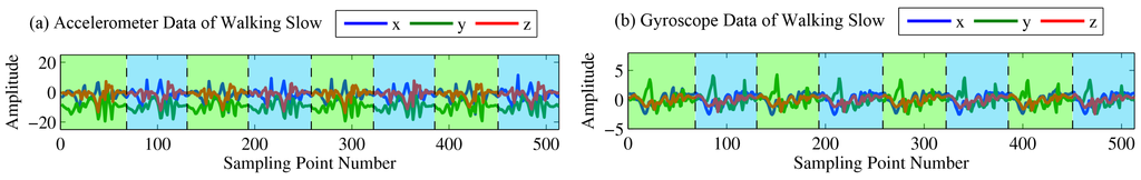 Accelerometer (a) and gyroscope (b) data of walking slowly.
